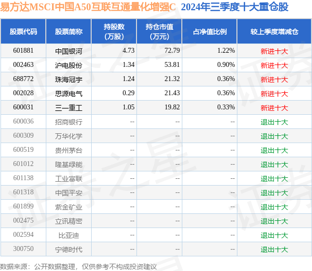 从基金规模来看,易方达MSCI中国A50互联互通量化增强C基金2024年三季度公布的基金规模为0.14亿元,较上一期规模1312.72万元变化了56.18万元,环比变化了4.28%。该基金最新一期资产配置为:股票占净值比94.05%,无债券类资产,现金占净值比6.31%。从基金持仓来看,该基金当季前十大股票仓位达3.17%,第一大重仓股为中国银河(601881),持仓占比为1.22%。