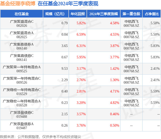 从基金规模来看,广发稳宏一年持有混合C基金2024年三季度公布的基金规模为0.4亿元,较上一期规模4592.91万元变化了-610.21万元,环比变化了-13.29%。该基金最新一期资产配置为:股票占净值比34.75%,债券占净值比34.62%,现金占净值比31.59%。从基金持仓来看,该基金当季前十大股票仓位达16.39%,第一大重仓股为中航西飞(000768),持仓占比为5.59%。