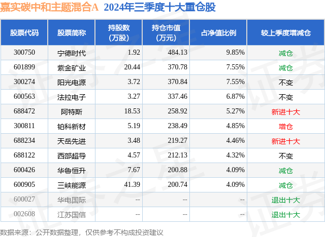 从基金规模来看,嘉实碳中和主题混合A基金2024年三季度公布的基金规模为0.2亿元,较上一期规模1789.31万元变化了162.71万元,环比变化了9.09%。该基金最新一期资产配置为:股票占净值比92.03%,无债券类资产,现金占净值比7.76%。从基金持仓来看,该基金当季前十大股票仓位达58.9%,第一大重仓股为宁德时代(300750),持仓占比为9.85%。