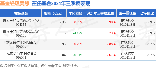 从基金规模来看,嘉实价值丰润混合A基金2024年三季度公布的基金规模为0.95亿元,较上一期规模8856.6万元变化了680.07万元,环比变化了7.68%。该基金最新一期资产配置为:股票占净值比86.02%,无债券类资产,现金占净值比14.18%。从基金持仓来看,该基金当季前十大股票仓位达58.29%,第一大重仓股为春秋航空(601021),持仓占比为6.97%。