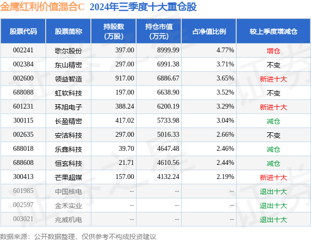 从基金规模来看,金鹰红利价值混合C基金2024年三季度公布的基金规模为3.25亿元,较上一期规模3.06亿元变化了1900.22万元,环比变化了6.22%。该基金最新一期资产配置为:股票占净值比79.04%,债券占净值比12.86%,现金占净值比8.13%。从基金持仓来看,该基金当季前十大股票仓位达31.73%,第一大重仓股为歌尔股份(002241),持仓占比为4.77%。