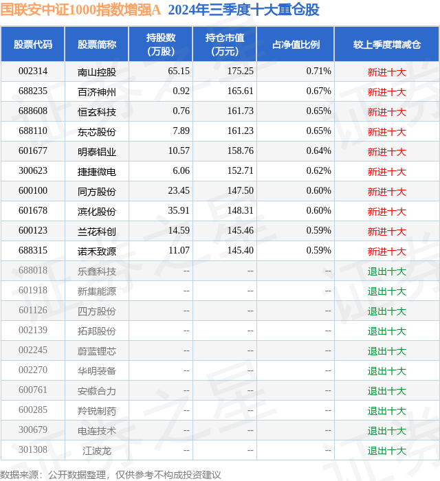 从基金规模来看,国联安中证1000指数增强A基金2024年三季度公布的基金规模为1.09亿元,较上一期规模9081.59万元变化了1841.1万元,环比变化了20.27%。该基金最新一期资产配置为:股票占净值比92.98%,无债券类资产,现金占净值比0.43%。从基金持仓来看,该基金当季前十大股票仓位达6.32%,第一大重仓股为南山控股(002314),持仓占比为0.71%。