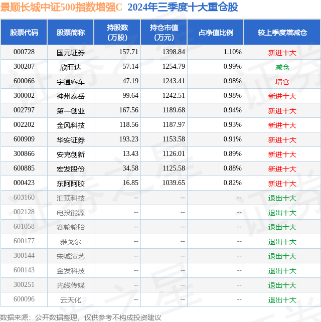 从基金规模来看,景顺长城中证500指数增强C基金2024年三季度公布的基金规模为0.17亿元,较上一期规模1968.14万元变化了-235.43万元,环比变化了-11.96%。该基金最新一期资产配置为:股票占净值比93.88%,无债券类资产,现金占净值比6.71%。从基金持仓来看,该基金当季前十大股票仓位达9.42%,第一大重仓股为国元证券(000728),持仓占比为1.1%。