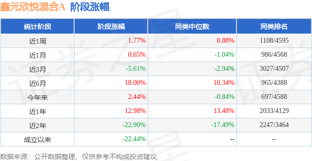 从业绩表现来看,鑫元欣悦混合A基金过去一年净值涨幅为2.03%,在同类基金中排名2630/3979,同类基金过去一年净值涨幅中位数为5.4%。而基金过去一年的最大回撤为-29.97%,成立以来的最大回撤为-40.32%。