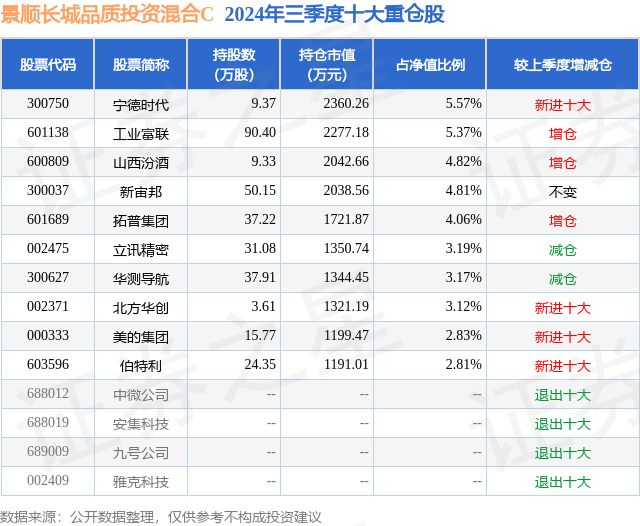 从基金规模来看,景顺长城品质投资混合C基金2024年三季度公布的基金规模为0.01亿元,较上一期规模25.99万元变化了108.63万元,环比变化了418.01%。该基金最新一期资产配置为:股票占净值比82.67%,无债券类资产,现金占净值比15.01%。从基金持仓来看,该基金当季前十大股票仓位达39.75%,第一大重仓股为宁德时代(300750),持仓占比为5.57%。