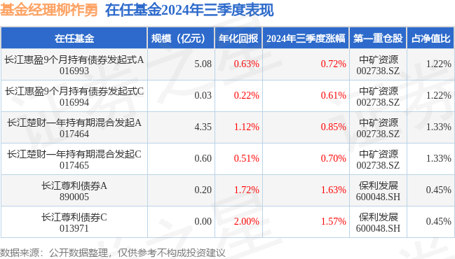 从基金规模来看,长江惠盈9个月持有债券发起式C基金2024年三季度公布的基金规模为0.03亿元,较上一期规模313.97万元变化了-7.93万元,环比变化了-2.53%。该基金最新一期资产配置为:股票占净值比6.89%,债券占净值比90.02%,现金占净值比1.23%。从基金持仓来看,该基金当季前十大股票仓位达6.21%,第一大重仓股为中矿资源(002738),持仓占比为1.22%。