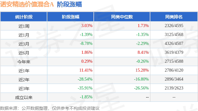 从业绩表现来看,诺安精选价值混合A基金过去一年净值涨幅为0.39%,在同类基金中排名2832/3979,同类基金过去一年净值涨幅中位数为5.4%。而基金过去一年的最大回撤为-36.06%,成立以来的最大回撤为-56.91%。