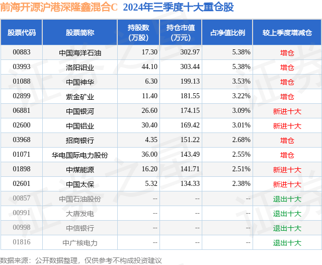 从基金规模来看,前海开源沪港深隆鑫混合C基金2024年三季度公布的基金规模为0.38亿元,较上一期规模3309.53万元变化了483.05万元,环比变化了14.6%。该基金最新一期资产配置为:股票占净值比60.47%,无债券类资产,现金占净值比44.55%。从基金持仓来看,该基金当季前十大股票仓位达33.73%,第一大重仓股为中国海洋石油(00883),持仓占比为5.38%。