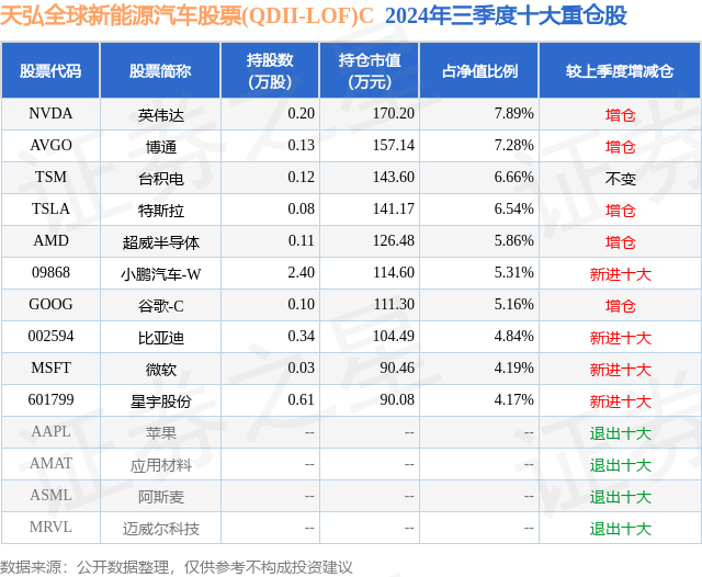证券之星消息,日前天弘全球新能源汽车股票(QDII-LOF)C基金公布三季报,2024年三季度最新规模0.18亿元,季度净值涨幅为0.72%。