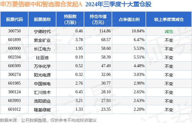 从基金规模来看,申万菱信碳中和智选混合发起A基金2024年三季度公布的基金规模为0.08亿元,较上一期规模720.55万元变化了84.37万元,环比变化了11.71%。该基金最新一期资产配置为:股票占净值比93.14%,无债券类资产,现金占净值比7.34%。从基金持仓来看,该基金当季前十大股票仓位达46.24%,第一大重仓股为宁德时代(300750),持仓占比为10.84%。