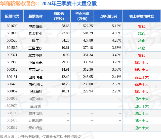 从基金规模来看,华商新常态混合C基金2024年三季度公布的基金规模为0.0亿元,较上一期规模27.43万元变化了10.52万元,环比变化了38.34%。该基金最新一期资产配置为:股票占净值比85.98%,无债券类资产,现金占净值比24.3%。从基金持仓来看,该基金当季前十大股票仓位达34.71%,第一大重仓股为中国铝业(601600),持仓占比为5.12%。