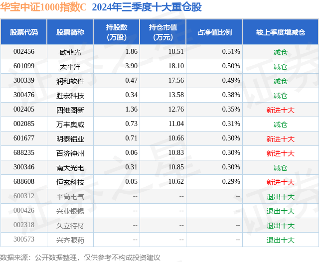 从基金规模来看,华宝中证1000指数C基金2024年三季度公布的基金规模为0.05亿元,较上一期规模756.96万元变化了-228.0万元,环比变化了-30.12%。该基金最新一期资产配置为:股票占净值比94.17%,无债券类资产,现金占净值比5.02%。从基金持仓来看,该基金当季前十大股票仓位达3.73%,第一大重仓股为欧菲光(002456),持仓占比为0.51%。