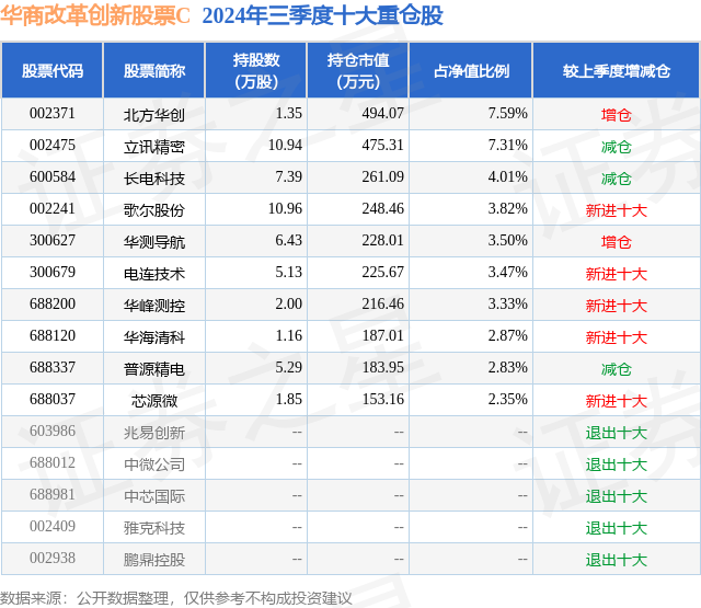 从基金规模来看,华商改革创新股票C基金2024年三季度公布的基金规模为0.01亿元,较上一期规模597.76万元变化了-494.0万元,环比变化了-82.64%。该基金最新一期资产配置为:股票占净值比92.54%,无债券类资产,现金占净值比9.61%。从基金持仓来看,该基金当季前十大股票仓位达41.08%,第一大重仓股为北方华创(002371),持仓占比为7.59%。