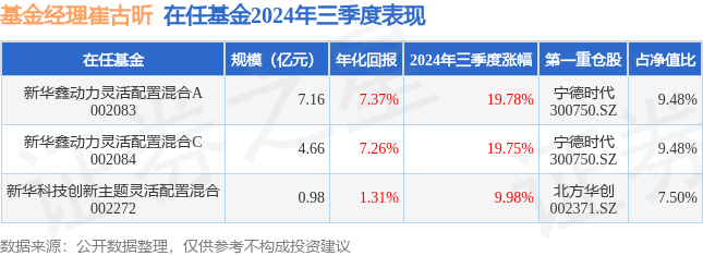 证券之星消息,日前新华鑫动力灵活配置混合A基金公布三季报,2024年三季度最新规模7.16亿元,季度净值涨幅为19.78%。