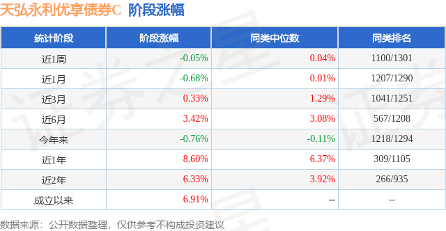 从业绩表现来看,天弘永利优享债券C基金过去一年净值涨幅为7.03%,在同类基金中排名132/1063,同类基金过去一年净值涨幅中位数为4.0%。而基金过去一年的最大回撤为-2.38%,成立以来的最大回撤为-3.46%。