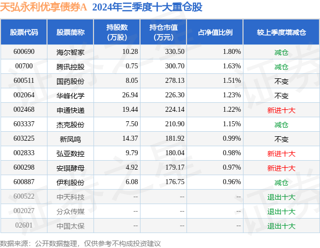 从基金规模来看,天弘永利优享债券A基金2024年三季度公布的基金规模为0.33亿元,较上一期规模3831.21万元变化了-558.54万元,环比变化了-14.58%。该基金最新一期资产配置为:股票占净值比18.38%,债券占净值比105.12%,现金占净值比0.48%。从基金持仓来看,该基金当季前十大股票仓位达12.44%,第一大重仓股为海尔智家(600690),持仓占比为1.8%。