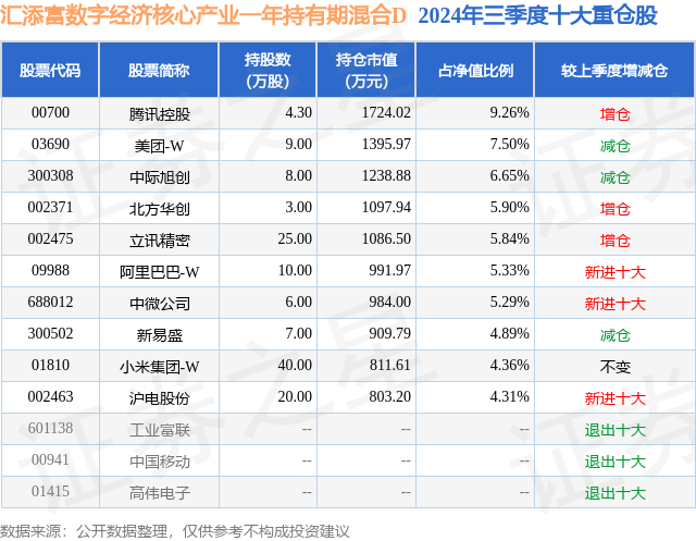 证券之星消息,日前汇添富数字经济核心产业一年持有期混合D基金公布三季报,2024年三季度最新规模0.01亿元,季度净值涨幅为9.99%。