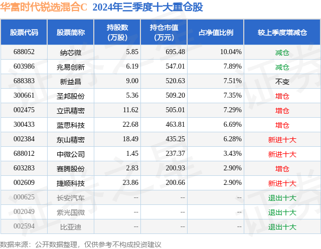从基金规模来看,华富时代锐选混合C基金2024年三季度公布的基金规模为0.09亿元,较上一期规模908.64万元变化了32.63万元,环比变化了3.59%。该基金最新一期资产配置为:股票占净值比87.74%,债券占净值比1.04%,现金占净值比8.34%。从基金持仓来看,该基金当季前十大股票仓位达62.28%,第一大重仓股为纳芯微(688052),持仓占比为10.04%。