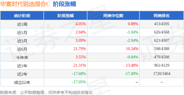 从业绩表现来看,华富时代锐选混合C基金过去一年净值涨幅为4.29%,在同类基金中排名2206/3979,同类基金过去一年净值涨幅中位数为5.4%。而基金过去一年的最大回撤为-34.34%,成立以来的最大回撤为-46.61%。