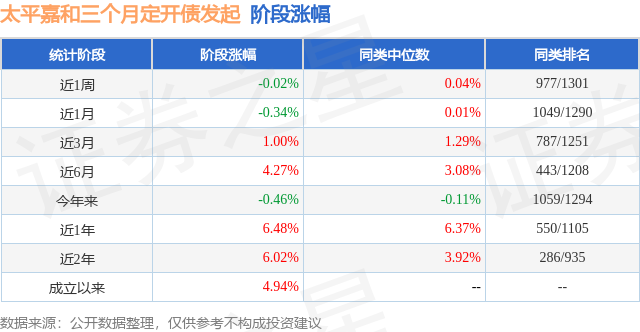 从业绩表现来看,太平嘉和三个月定开债发起基金过去一年净值涨幅为4.6%,在同类基金中排名442/1063,同类基金过去一年净值涨幅中位数为4.0%。而基金过去一年的最大回撤为-3.25%,成立以来的最大回撤为-4.25%。