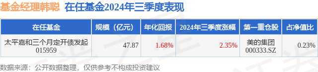 从基金规模来看,太平嘉和三个月定开债发起基金2024年三季度公布的基金规模为47.87亿元,较上一期规模46.77亿元变化了1.1亿元,环比变化了2.34%。该基金最新一期资产配置为:股票占净值比16.66%,债券占净值比91.31%,现金占净值比0.19%。从基金持仓来看,该基金当季前十大股票仓位达1.87%,第一大重仓股为美的集团(000333),持仓占比为0.23%。