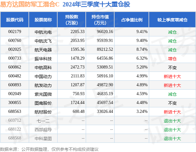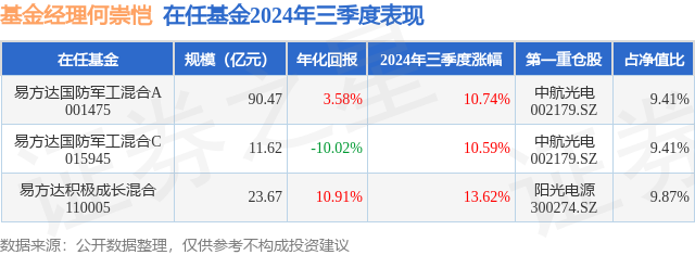 证券之星消息,日前易方达国防军工混合C基金公布三季报,2024年三季度最新规模11.62亿元,季度净值涨幅为10.59%。