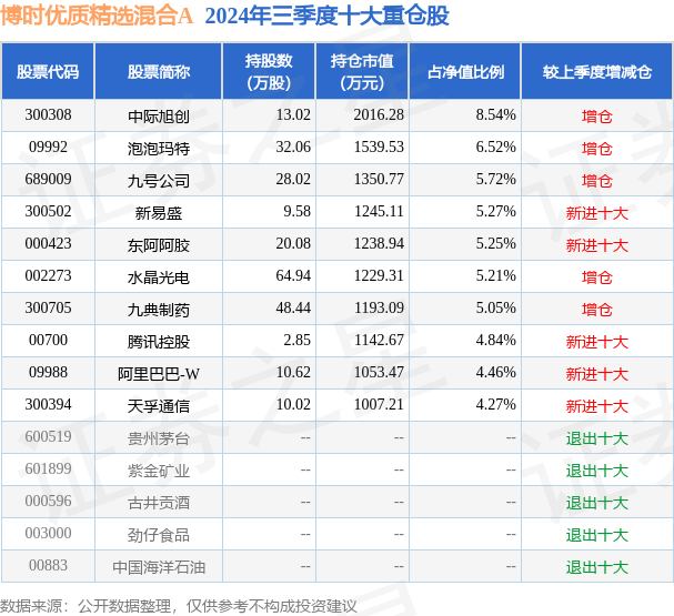 从基金规模来看,博时优质精选混合A基金2024年三季度公布的基金规模为2.21亿元,较上一期规模2.13亿元变化了827.68万元,环比变化了3.88%。该基金最新一期资产配置为:股票占净值比87.62%,无债券类资产,现金占净值比13.32%。从基金持仓来看,该基金当季前十大股票仓位达55.13%,第一大重仓股为中际旭创(300308),持仓占比为8.54%。