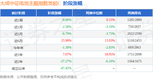 从业绩表现来看,大成中证电池主题指数发起C基金过去一年净值涨幅为6.67%,在同类基金中排名1535/1981,同类基金过去一年净值涨幅中位数为13.77%。而基金过去一年的最大回撤为-28.09%,成立以来的最大回撤为-60.78%。