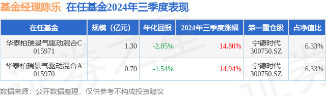 华泰柏瑞景气驱动混合A现任基金经理为陈乐。其中在任基金经理陈乐已从业1年又72天,2023年8月17日正式接手管理华泰柏瑞景气驱动混合A,任职期间累计回报为12.33%。目前还管理着2只基金产品(包括A类和C类),其中本季度表现最佳的基金为华泰柏瑞景气驱动混合A(015970),季度净值涨幅为14.94%。