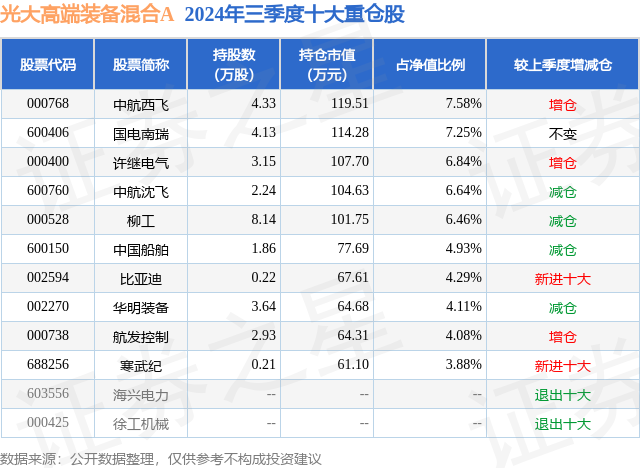 从基金规模来看,光大高端装备混合A基金2024年三季度公布的基金规模为0.04亿元,较上一期规模442.04万元变化了1.12万元,环比变化了0.25%。该基金最新一期资产配置为:股票占净值比83.37%,无债券类资产,现金占净值比10.92%。从基金持仓来看,该基金当季前十大股票仓位达56.06%,第一大重仓股为中航西飞(000768),持仓占比为7.58%。