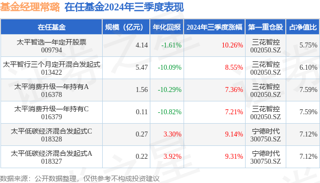 从基金规模来看,太平消费升级一年持有A基金2024年三季度公布的基金规模为1.56亿元,较上一期规模1.46亿元变化了982.09万元,环比变化了6.74%。该基金最新一期资产配置为:股票占净值比82.52%,无债券类资产,现金占净值比17.64%。从基金持仓来看,该基金当季前十大股票仓位达50.4%,第一大重仓股为三花智控(002050),持仓占比为7.59%。
