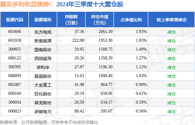 从基金规模来看,嘉实多利收益债券C基金2024年三季度公布的基金规模为0.0亿元,较上一期规模47.48万元变化了-32.63万元,环比变化了-68.72%。该基金最新一期资产配置为:股票占净值比19.28%,债券占净值比80.9%,现金占净值比0.35%。从基金持仓来看,该基金当季前十大股票仓位达11.33%,第一大重仓股为东方电缆(603606),持仓占比为1.93%。
