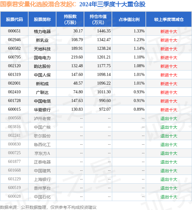 从基金规模来看,国泰君安量化选股混合发起C基金2024年三季度公布的基金规模为2.78亿元,较上一期规模3.05亿元变化了-2774.12万元,环比变化了-9.08%。该基金最新一期资产配置为:股票占净值比90.12%,无债券类资产,现金占净值比10.09%。从基金持仓来看,该基金当季前十大股票仓位达10.63%,第一大重仓股为格力电器(000651),持仓占比为1.33%。