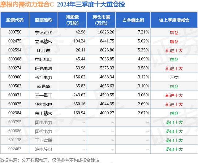 从基金规模来看,摩根内需动力混合C基金2024年三季度公布的基金规模为0.02亿元,较上一期规模185.16万元变化了11.39万元,环比变化了6.15%。该基金最新一期资产配置为:股票占净值比86.43%,无债券类资产,现金占净值比13.75%。从基金持仓来看,该基金当季前十大股票仓位达41.09%,第一大重仓股为宁德时代(300750),持仓占比为7.21%。