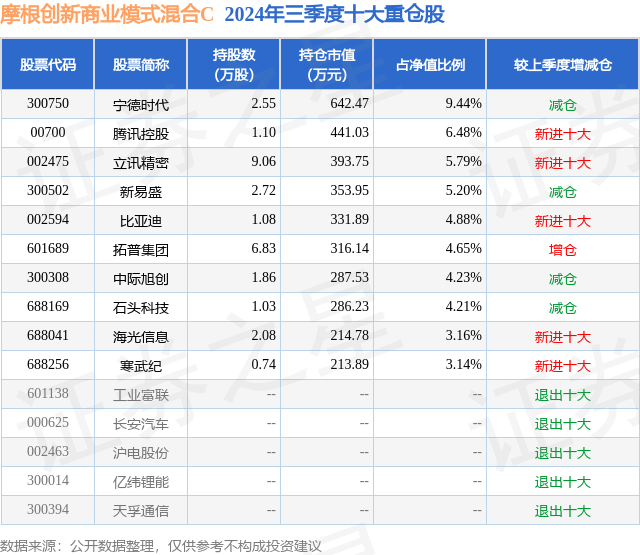 从基金规模来看,摩根创新商业模式混合C基金2024年三季度公布的基金规模为0.0亿元,较上一期规模5.01万元变化了2.73万元,环比变化了54.44%。该基金最新一期资产配置为:股票占净值比93.33%,无债券类资产,现金占净值比6.43%。从基金持仓来看,该基金当季前十大股票仓位达51.18%,第一大重仓股为宁德时代(300750),持仓占比为9.44%。