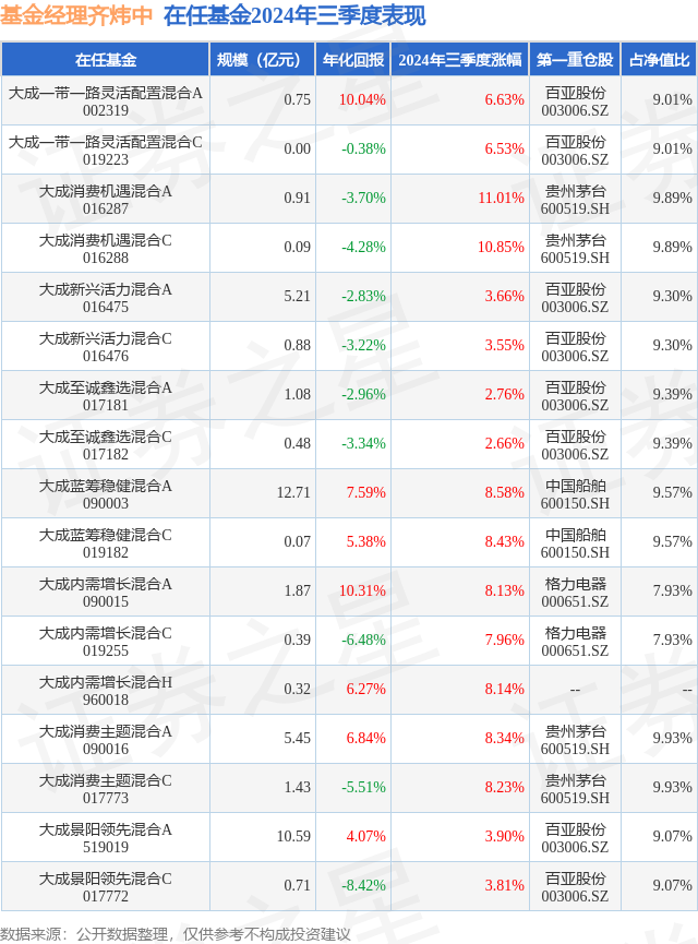 证券之星消息,日前大成新兴活力混合A基金公布三季报,2024年三季度最新规模5.21亿元,季度净值涨幅为3.66%。
