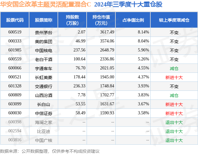 从基金规模来看,华安国企改革主题灵活配置混合C基金2024年三季度公布的基金规模为0.05亿元,较上一期规模568.53万元变化了-61.91万元,环比变化了-10.89%。该基金最新一期资产配置为:股票占净值比89.12%,无债券类资产,现金占净值比11.65%。从基金持仓来看,该基金当季前十大股票仓位达51.33%,第一大重仓股为贵州茅台(600519),持仓占比为8.14%。