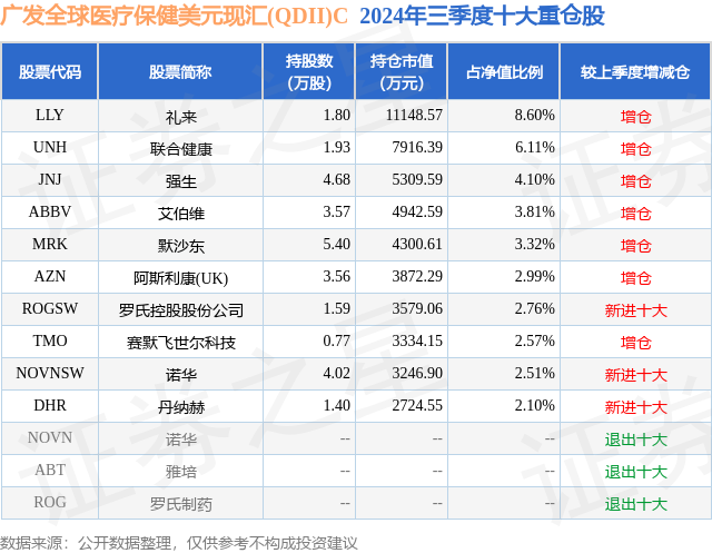 从基金规模来看,广发全球医疗保健美元现汇(QDII)C基金2024年三季度公布的基金规模为2.6亿元,较上一期规模1.64亿元变化了9666.8万元,环比变化了59.12%。该基金最新一期资产配置为:股票占净值比84.94%,无债券类资产,现金占净值比10.1%。从基金持仓来看,该基金当季前十大股票仓位达38.87%,第一大重仓股为礼来(LLY),持仓占比为8.6%。