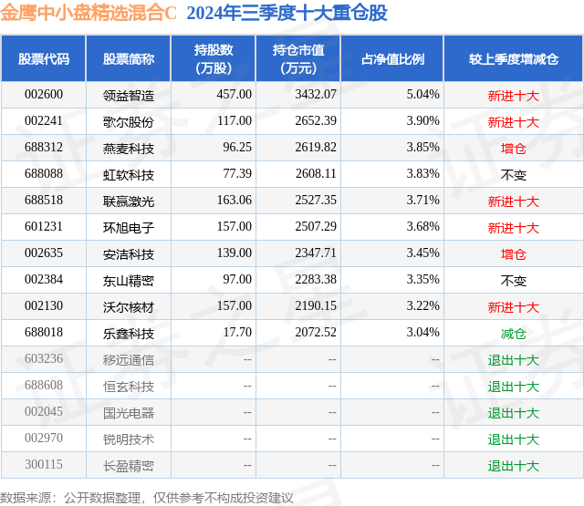 证券之星消息,日前金鹰中小盘精选混合C基金公布三季报,2024年三季度最新规模0.22亿元,季度净值涨幅为10.9%。