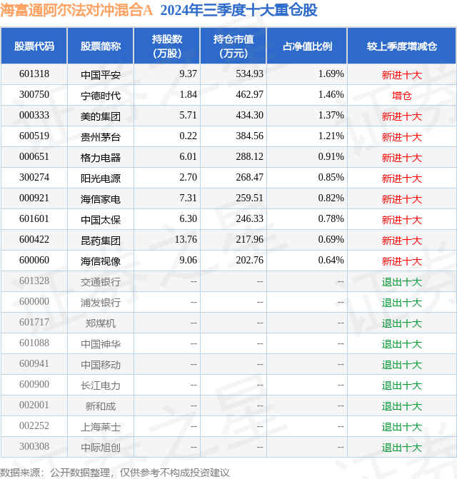 从基金规模来看,海富通阿尔法对冲混合A基金2024年三季度公布的基金规模为2.86亿元,较上一期规模3.24亿元变化了-3829.96万元,环比变化了-11.83%。该基金最新一期资产配置为:股票占净值比77.47%,债券占净值比4.79%,现金占净值比8.26%。从基金持仓来看,该基金当季前十大股票仓位达10.42%,第一大重仓股为中国平安(601318),持仓占比为1.69%。