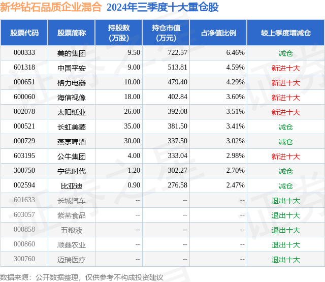 从基金规模来看,新华钻石品质企业混合基金2024年三季度公布的基金规模为1.12亿元,较上一期规模9575.26万元变化了1610.97万元,环比变化了16.82%。该基金最新一期资产配置为:股票占净值比93.81%,无债券类资产,现金占净值比7.74%。从基金持仓来看,该基金当季前十大股票仓位达37.03%,第一大重仓股为美的集团(000333),持仓占比为6.46%。