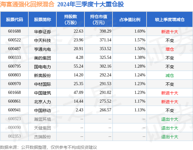 从基金规模来看,海富通强化回报混合基金2024年三季度公布的基金规模为2.36亿元,较上一期规模2.26亿元变化了1065.77万元,环比变化了4.72%。该基金最新一期资产配置为:股票占净值比71.79%,债券占净值比31.2%,现金占净值比1.75%。从基金持仓来看,该基金当季前十大股票仓位达13.42%,第一大重仓股为华泰证券(601688),持仓占比为1.69%。