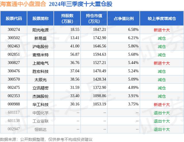 从基金规模来看,海富通中小盘混合基金2024年三季度公布的基金规模为2.81亿元,较上一期规模3.33亿元变化了-5244.91万元,环比变化了-15.74%。该基金最新一期资产配置为:股票占净值比93.78%,无债券类资产,现金占净值比6.39%。从基金持仓来看,该基金当季前十大股票仓位达52.65%,第一大重仓股为阳光电源(300274),持仓占比为6.58%。