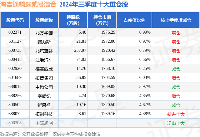从基金规模来看,海富通精选贰号混合基金2024年三季度公布的基金规模为2.83亿元,较上一期规模2.53亿元变化了2973.0万元,环比变化了11.75%。该基金最新一期资产配置为:股票占净值比77.82%,债券占净值比20.35%,现金占净值比2.56%。从基金持仓来看,该基金当季前十大股票仓位达59.46%,第一大重仓股为北方华创(002371),持仓占比为6.99%。