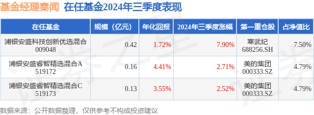 证券之星消息,日前浦银安盛睿智精选混合C基金公布三季报,2024年三季度最新规模0.13亿元,季度净值涨幅为2.52%。