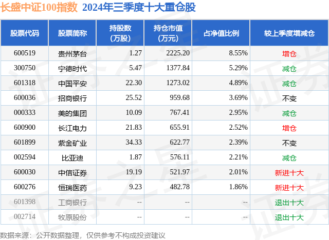 从基金规模来看,长盛中证100指数基金2024年三季度公布的基金规模为2.6亿元,较上一期规模2.23亿元变化了3762.2万元,环比变化了16.9%。该基金最新一期资产配置为:股票占净值比94.44%,债券占净值比0.8%,现金占净值比5.12%。从基金持仓来看,该基金当季前十大股票仓位达36.36%,第一大重仓股为贵州茅台(600519),持仓占比为8.55%。
