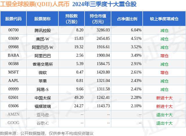 从基金规模来看,工银全球股票(QDII)人民币基金2024年三季度公布的基金规模为5.44亿元,较上一期规模5.27亿元变化了1666.68万元,环比变化了3.16%。该基金最新一期资产配置为:股票占净值比83.08%,无债券类资产,现金占净值比8.29%。从基金持仓来看,该基金当季前十大股票仓位达32.3%,第一大重仓股为腾讯控股(00700),持仓占比为6.04%。