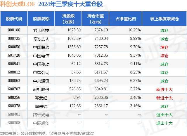 从基金规模来看,科创大成LOF基金2024年三季度公布的基金规模为7.23亿元,较上一期规模7.27亿元变化了-330.7万元,环比变化了-0.46%。该基金最新一期资产配置为:股票占净值比84.03%,无债券类资产,现金占净值比16.09%。从基金持仓来看,该基金当季前十大股票仓位达74.83%,第一大重仓股为TCL科技(000100),持仓占比为10.25%。