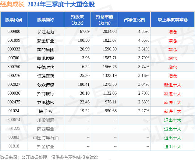 从基金规模来看,经典成长基金2024年三季度公布的基金规模为4.19亿元,较上一期规模3.84亿元变化了3495.14万元,环比变化了9.09%。该基金最新一期资产配置为:股票占净值比90.95%,无债券类资产,现金占净值比12.54%。从基金持仓来看,该基金当季前十大股票仓位达34.04%,第一大重仓股为长江电力(600900),持仓占比为4.85%。