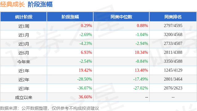 从业绩表现来看,经典成长基金过去一年净值涨幅为6.2%,在同类基金中排名1635/3979,同类基金过去一年净值涨幅中位数为5.4%。而基金过去一年的最大回撤为-26.05%,成立以来的最大回撤为-64.3%。